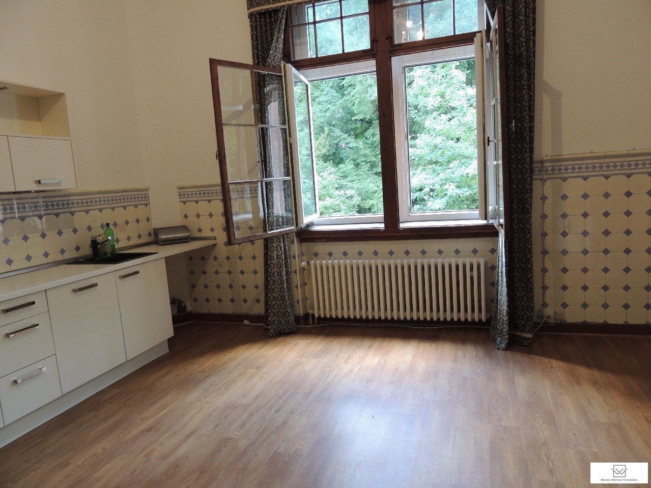 Die Wohnung im Erdgeschoss bietet gesamt 3 große Räume und eine riesige Wohnküche. Hohe Decken, Wandvertäfelung, massives Echtholzparkett, ein Badezimmer mit Wannenbad und Tageslichtfenster. Im Park stehen Ihnen auf Wunsch 2 Freisitze zur eigenen Nutzung zur Verfügung.